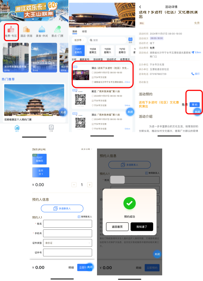 “湘易办”超级服务端(以下简称“湘易办”)新上线“惠民文旅”专区,旨在为广大用户提供更加丰富、便捷的文旅服务。专区包含查询、预约免费活动和场馆、购买景区门票、预订酒店民宿等服务功能,可为游客用户节省排队时间,让旅行更轻松便捷!