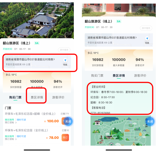 选择“景点・门票”,进入后可查询并购买景区门票。还可查询景区距离以及景区详情。