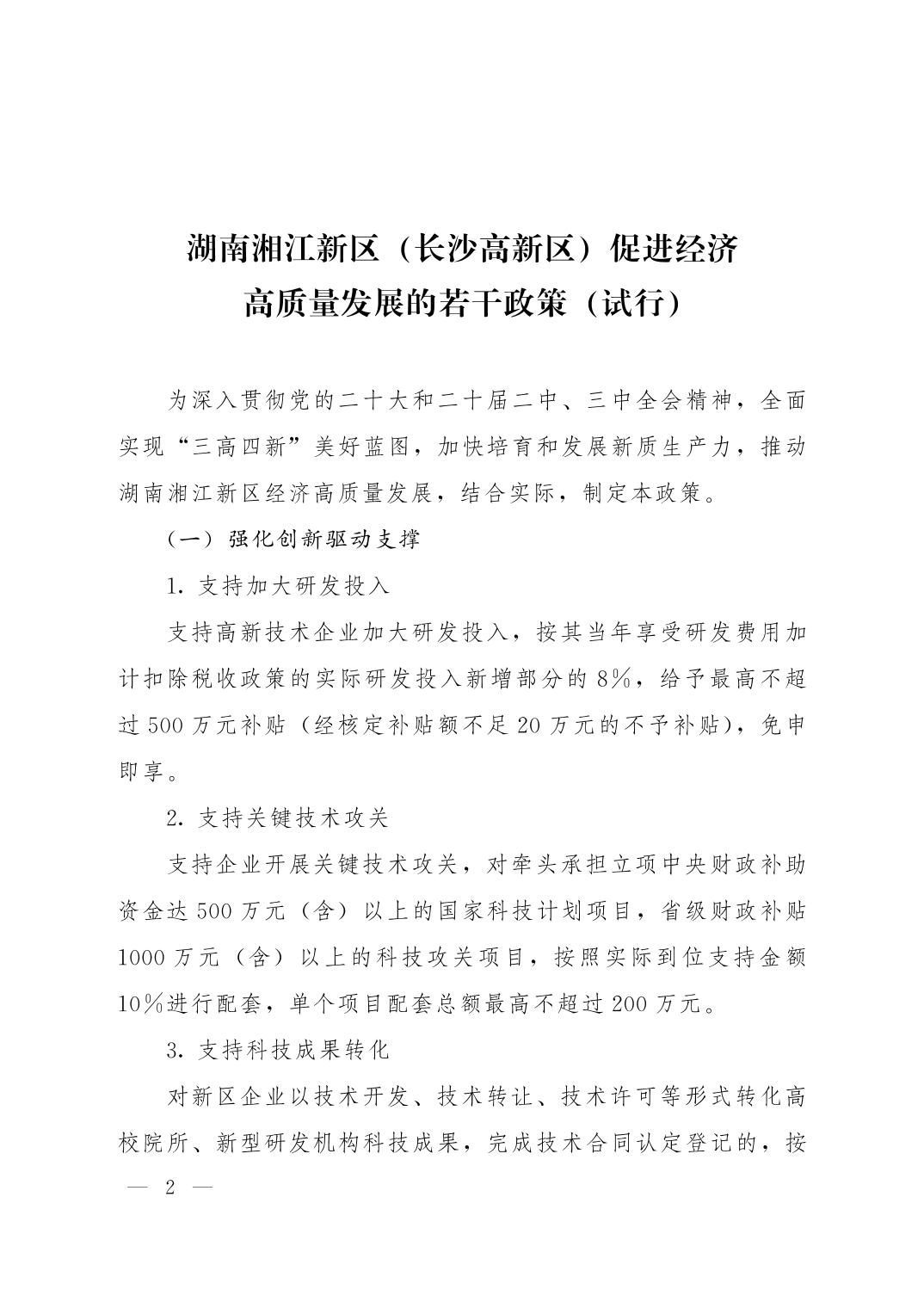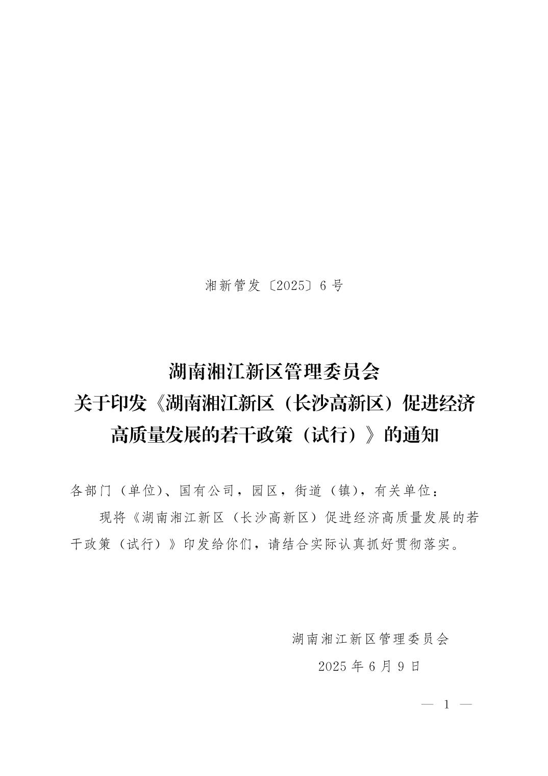 湖南湘江新区管理委员会关于印发《湖南湘江新区(长沙高新区)促进经济高质量发展的若干政策(试行)》的通知