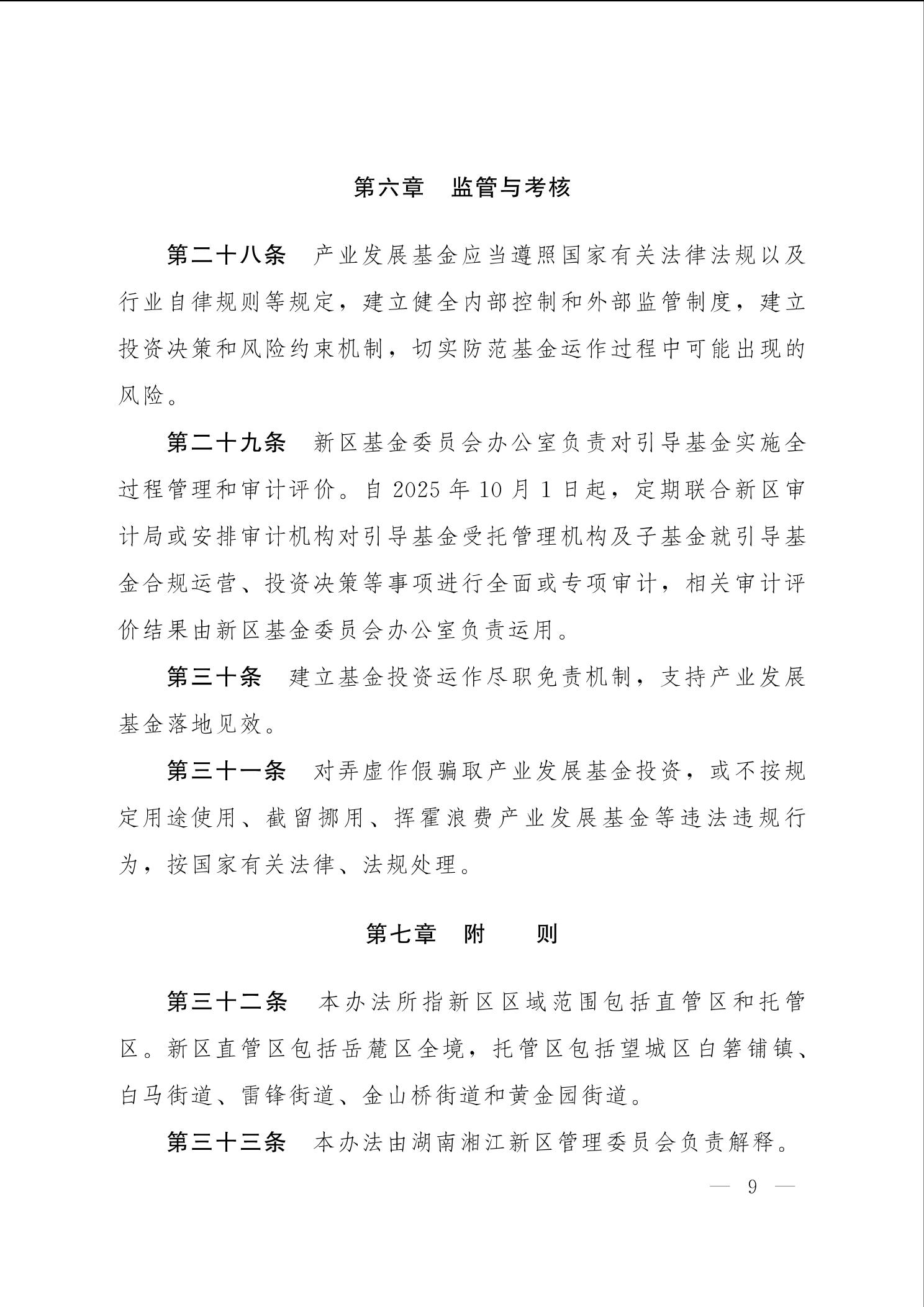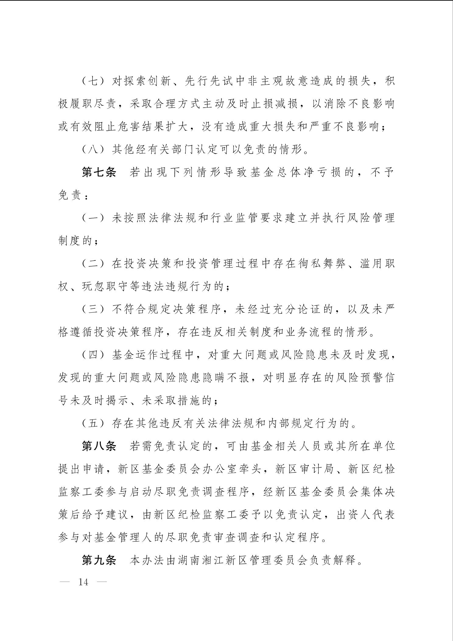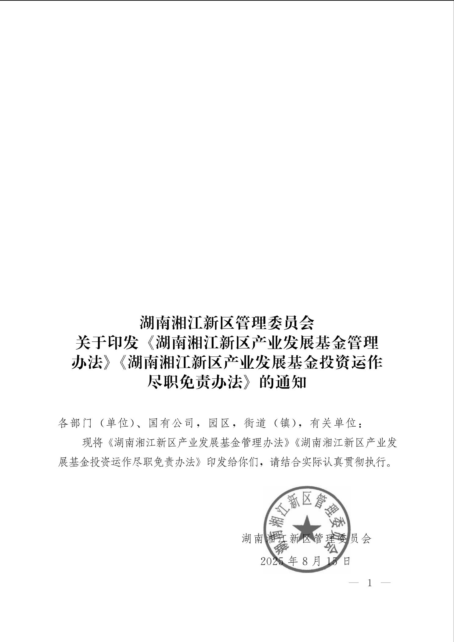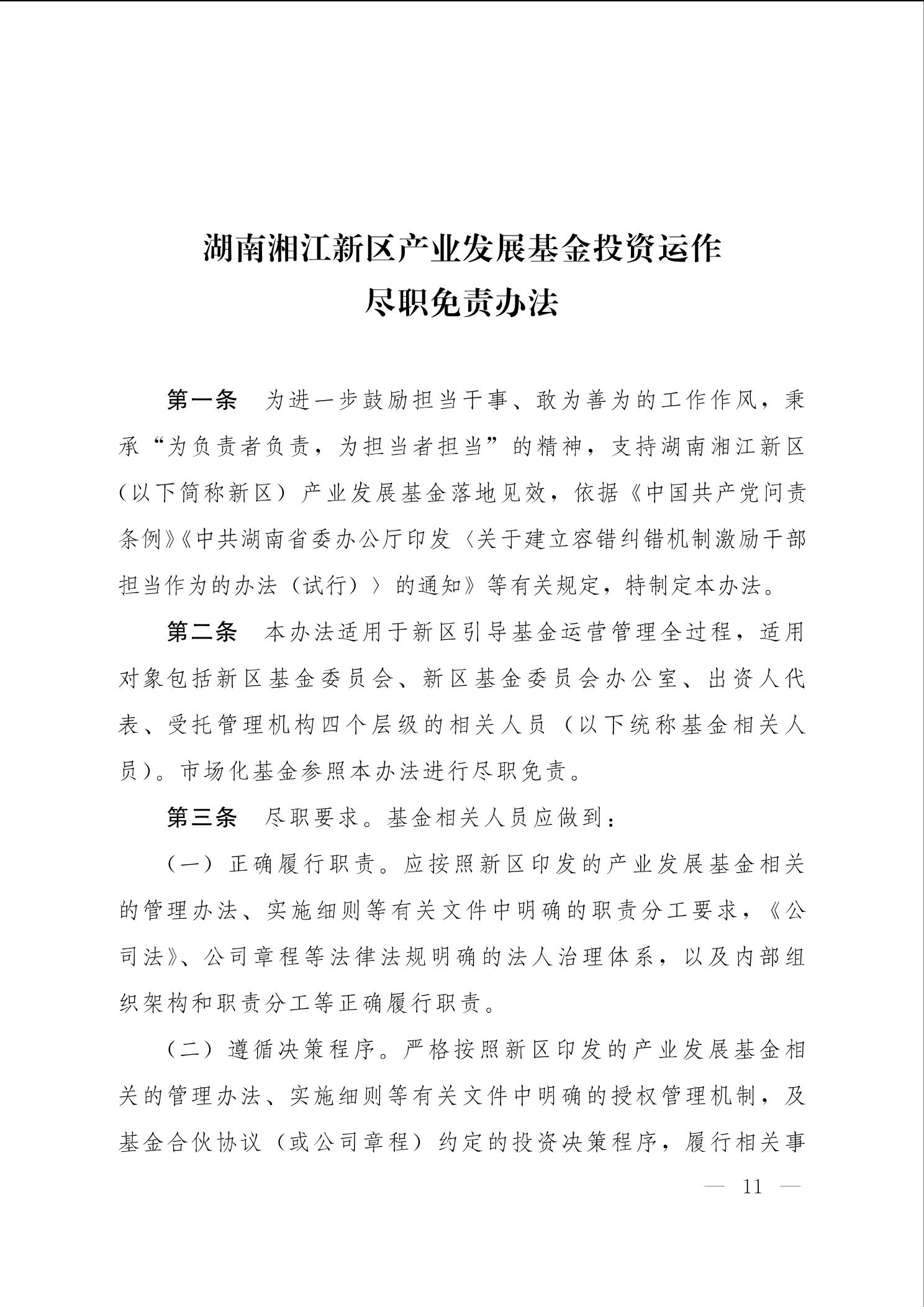关于印发《湖南湘江新区产业发展基金管理办法》《湖南湘江新区产业发展基金投资运作尽职免责办法》的通知