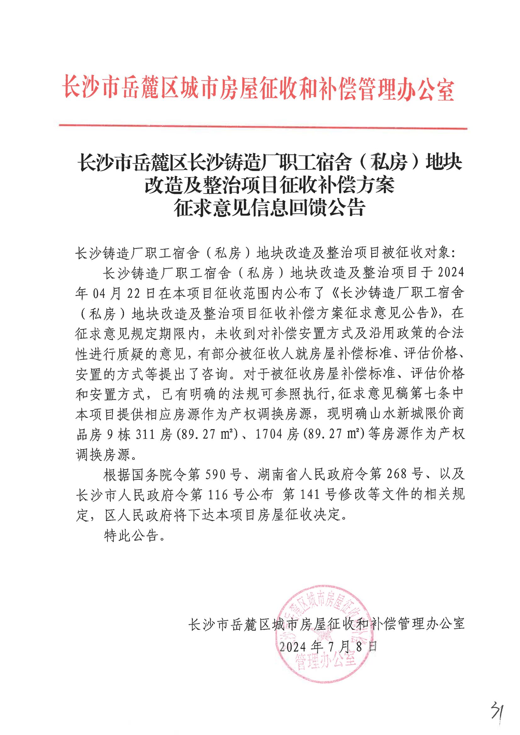 长沙铸造厂职工宿舍(私房)地块改造及整治项目征收补偿方案征求意见信息回馈公告